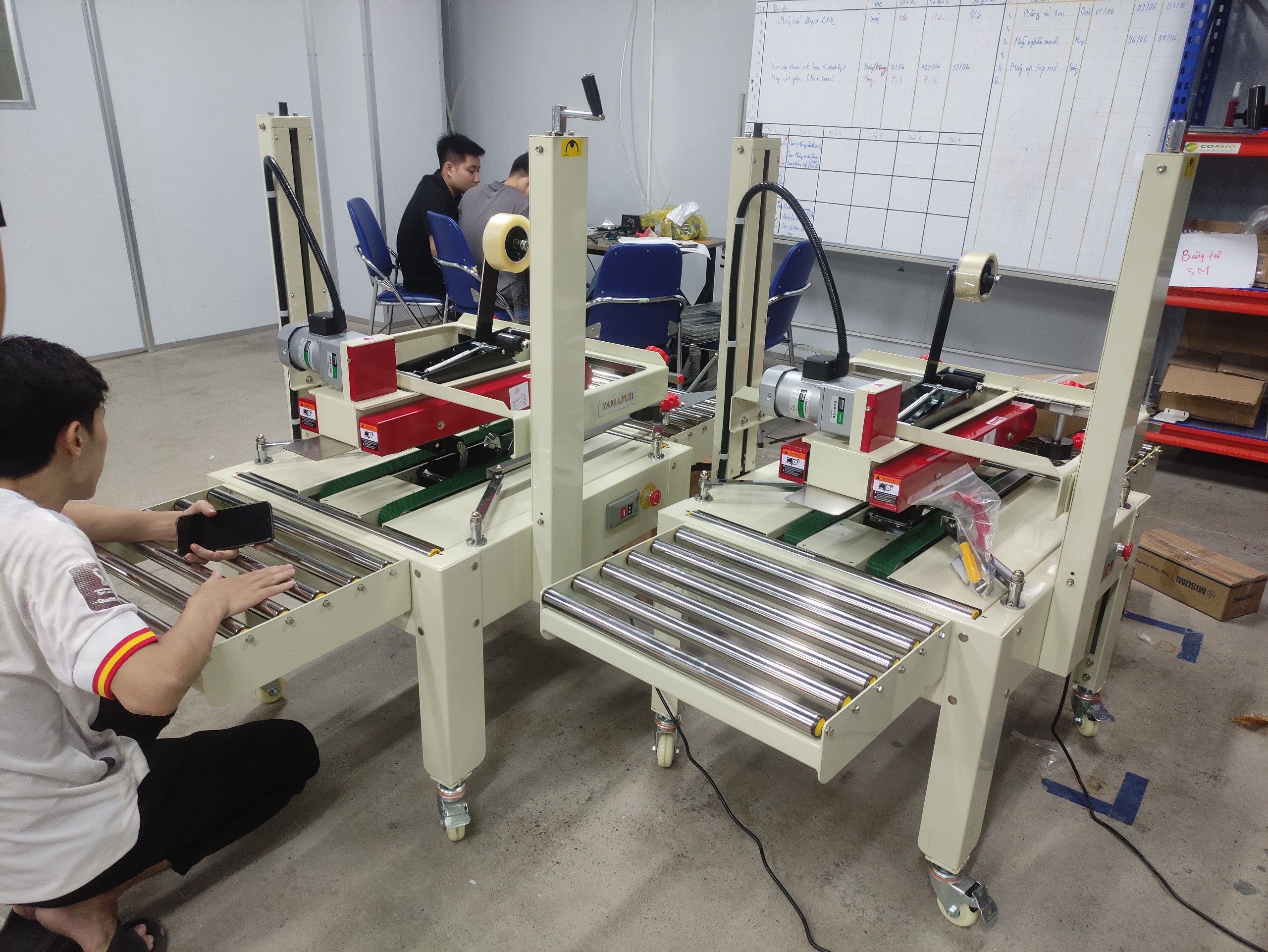 Khi máy bắt đầu hoạt động các con lăn quay đều để miết băng keo kết hợp với hệ thống belt truyền động hai bên để ép đẩy trượt thùng carton.